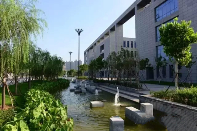 景觀設(shè)計(jì)中對水體的處理呼應(yīng)校園南面的南栗明渠,形成自北向南的校園主要景觀水系,水系蜿蜒曲折,又如傳統(tǒng)園林之“曲水流觴”,不但營造水清林茂的自然生態(tài)小氣候,更象征了知識的源泉源遠(yuǎn)流長,人文意境油然而生。沿水建連續(xù)的親水步道,和較為開闊的集散空間,形成曲線形的“與自然共舞”的脈絡(luò)線,營造“人與自然對話”的寧靜、平和的校園氛圍,滿足校園內(nèi)師生安全便捷的交通功能要求。